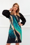 Wizytowa sukienka, bardzo prosta w kroju, a jednocześnie szalenie efektowna. Efekt ten nadaje piękny szmaragdowo-złoty w kolorystyce wzór na tkaninie dopełniony plisowanymi rękawami. Sukienka idealna na wesela i inne uroczystości, nie pozwoli pozostać niezauważoną.