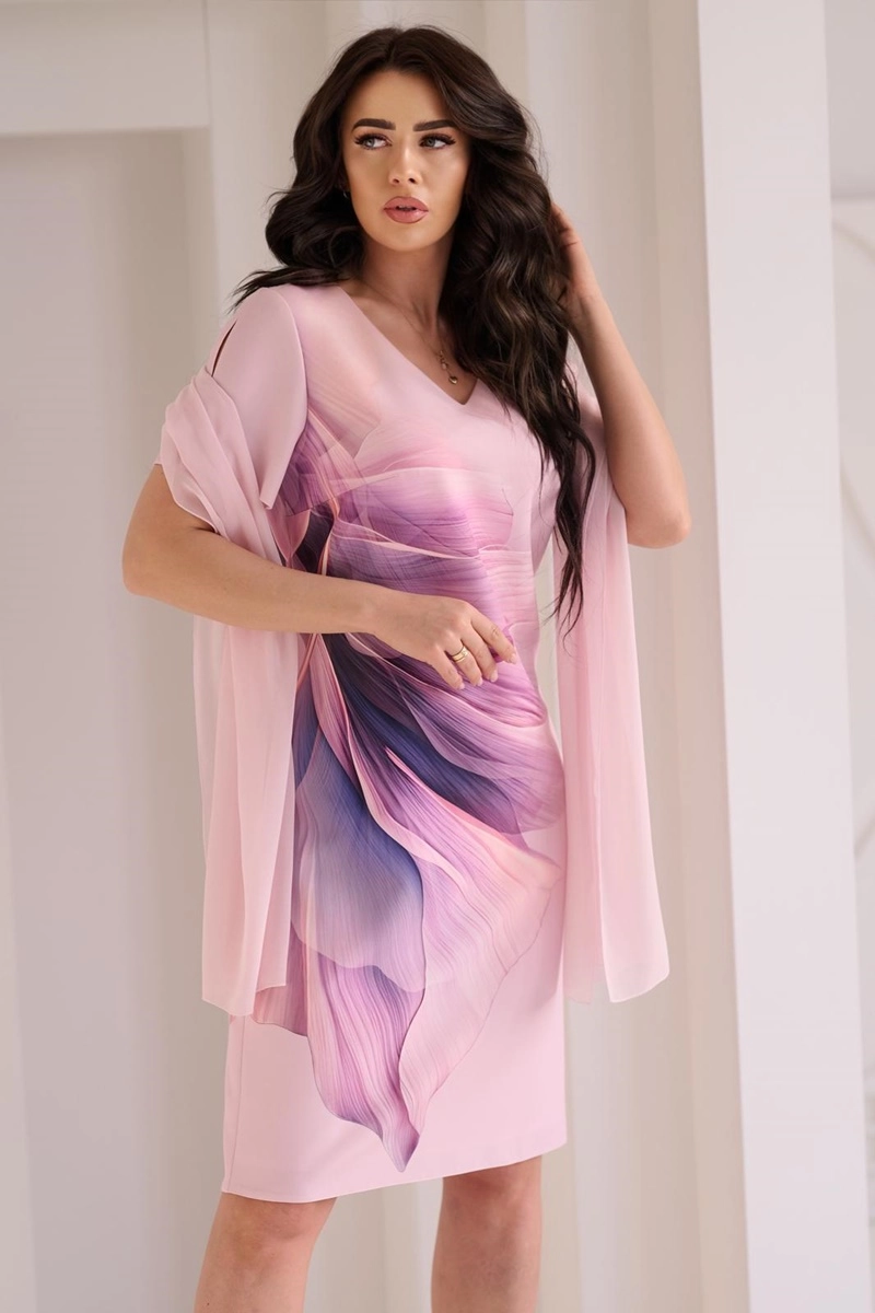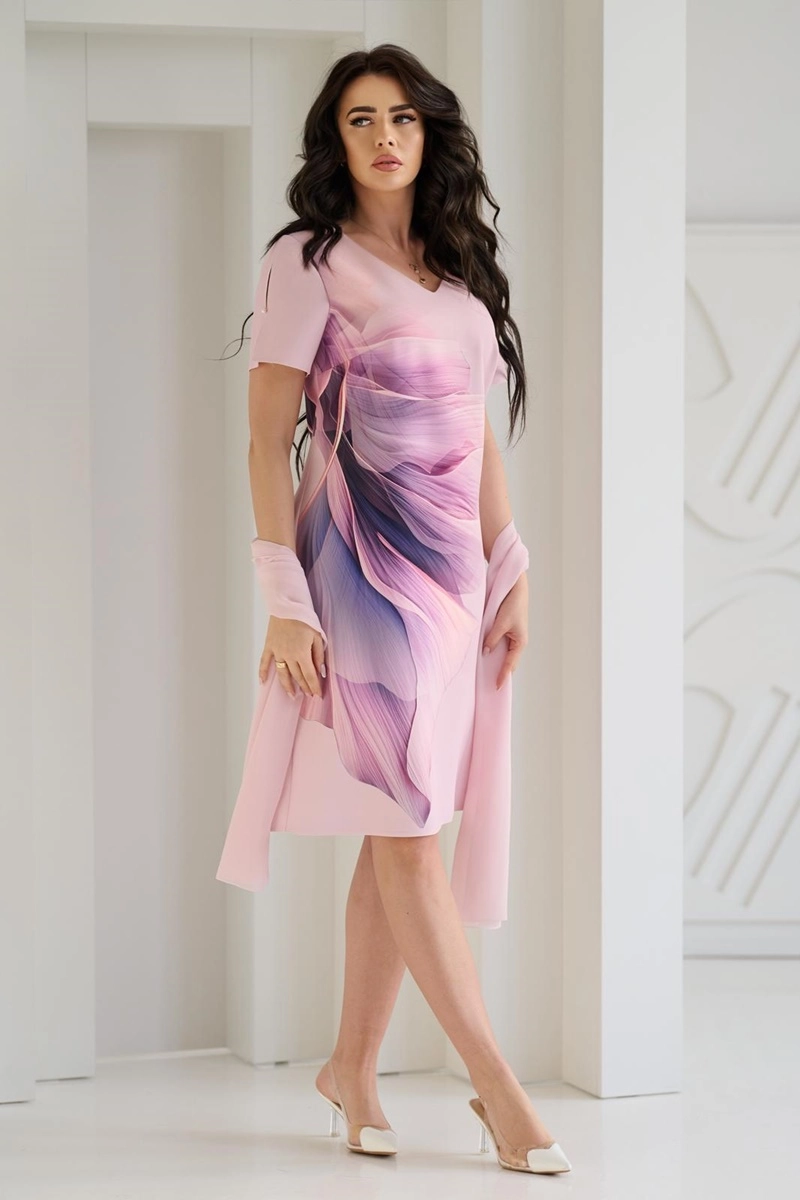 Klasyczna w kroju, elegancka, lekko dopasowana sukienka z tkaniny o długości w okolicy kolan. Bardzo kobieca i wyrazista. Zawsze lubiane zestawienie kolorów, nadają sukience świeży, elegancki charakter. O atrakcyjności tej prostej sukienki stanowi piękny wzór na tkaninie i ciepła kolorystyka. Rękaw ma z boku efektowne rozcięcie ozdobione perełką. Całości dopełnia szyfonowy szal, idealnie zharmonizowany kolorystycznie z sukienką.