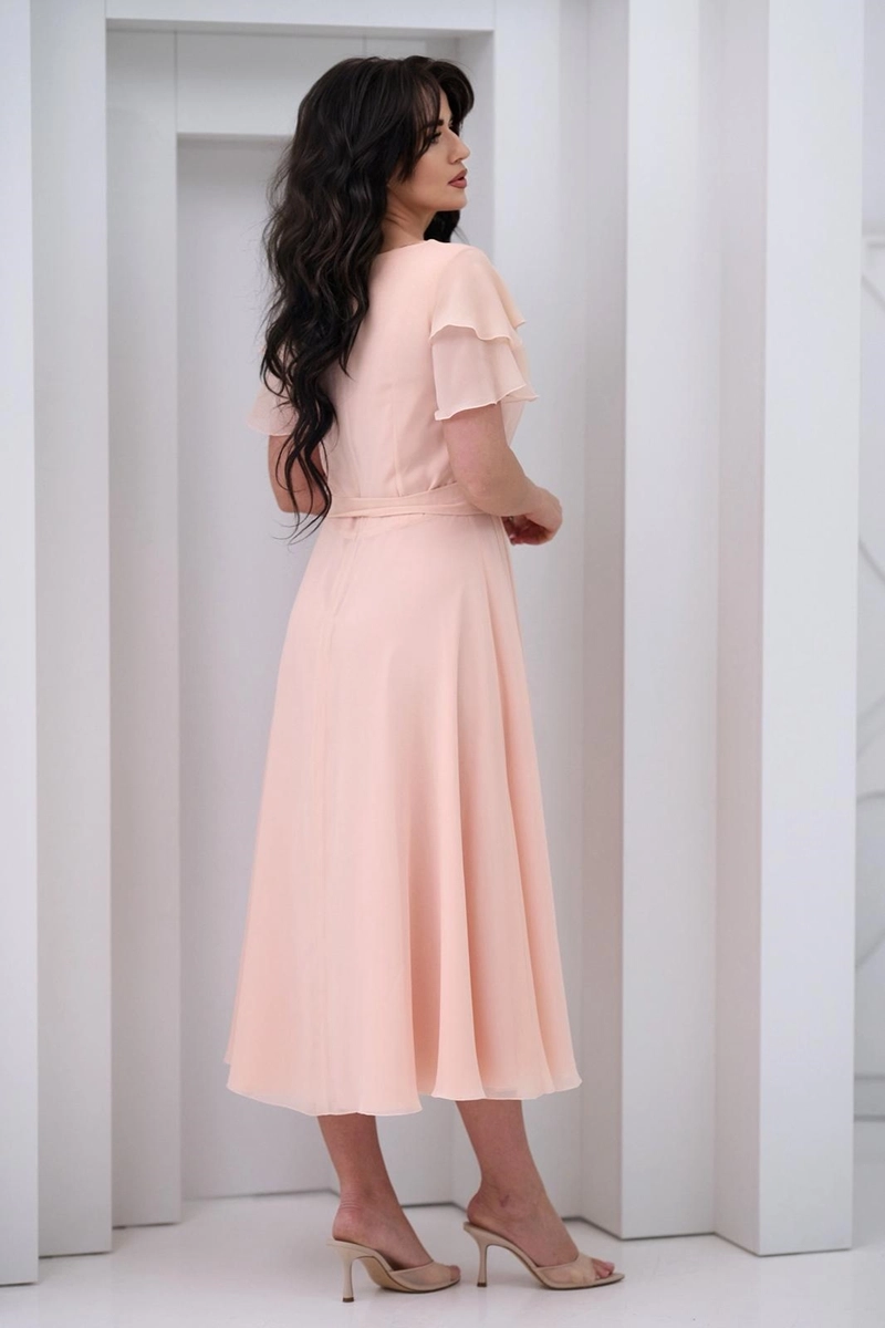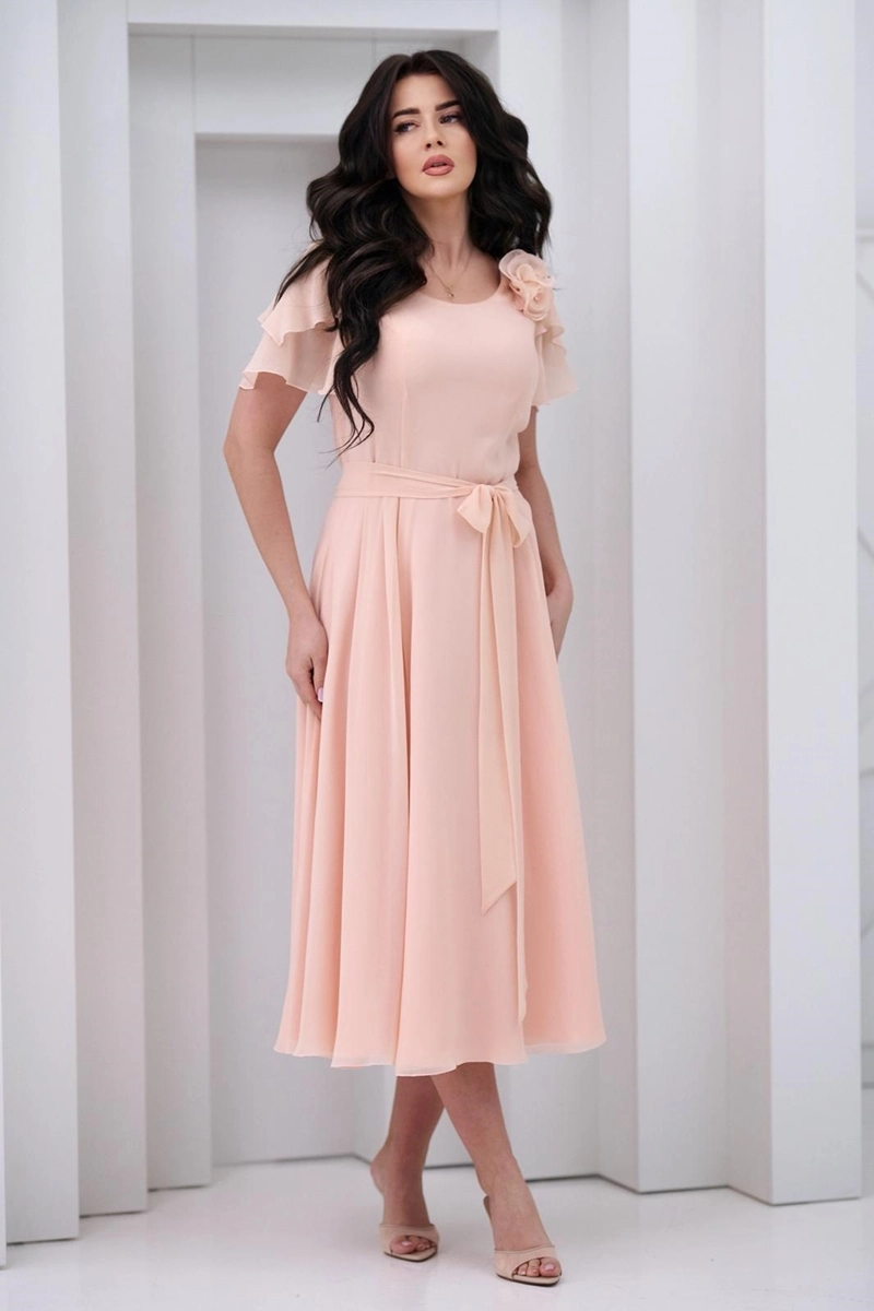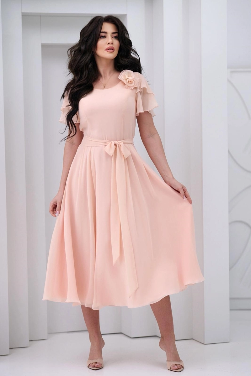 Zwiewna, długa suknia z wysokiej jakości szyfonu w pięknym pastelowym odcieniu brzoskwini. Góra sukienki dopasowana z dość dużym dekoltem i dwuwarstwowym rękawem. Dół jest rozkloszowany w wygodnej długości 7/8 czyli nie za długa, zdecydowanie nie za krótka. Suknia ma jeszcze szczególny dodatek w postaci pięknej róży, ręcznie wykonanej z tej samej tkaniny.