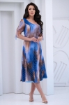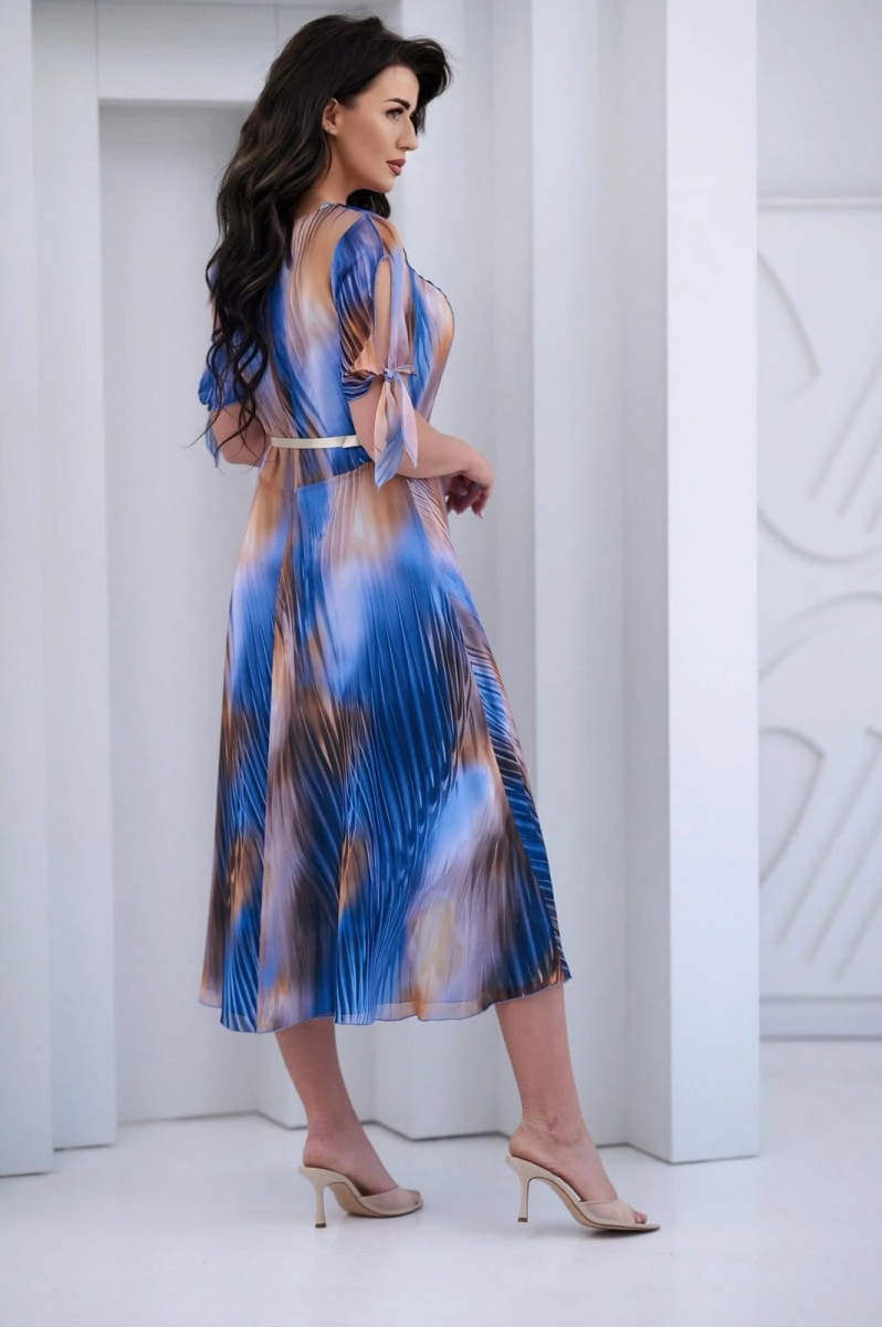 Zwiewna suknia z wysokiej jakości drukowanego szyfonu na satynowej podszewce. Góra sukienki dopasowana z dość dużym dekoltem i wiązanym rękawem. Dół jest rozkloszowany w wygodnej długości 3/4 czyli nie za długa, zdecydowanie nie za krótka. Suknia ma jeszcze szczególny dodatek w postaci subtelnego paska w złotym kolorze.
