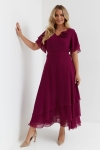 Szyfonowa, długa suknia z jednokolorowego delikatnego szyfonu w kolorze wrzosu wpadającego w amarant. Odcinana w talii. Spódnica trzywarstwowa z nakładanych na siebie asymetrycznych części. Góra sukienki na podszewce jest dopasowana z warstwowymi, asymetrycznymi rękawami nawiązującymi do dołu sukni. W tali wiązany pasek. Warstwowość sukni sprawia że nabiera ona lekkości i pięknie "porusza' się w tańcu i podczas chodzenia. Całość uzupełnia dopinana róża z tej samej tkaniny. Suknia idealna na wesela.