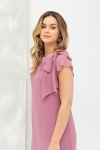 Efektowna sukienka wizytowa z gładkiego szyfonu. Dostępna w dwóch romantycznych kolorach. Sukienka o prostej linii, nie krępuje ruchów, jest lekka i zwiewna. Długość w okolicy kolana. Szarfa wiązana w kokardę i marszczenie przy dekolcie nadają sukience niezwykły, romantyczny charakter z nutką retro. Idealna na przyjęcia i wesela.
