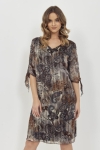 Prosta, klasyczna w kroju sukienka z dłuższymi rękawami. Oryginalna tkanina w spokojnej, stonowanej kolorystyce ze złotą nitką, sprawia wrażenie plisowanej. Ozdobny akcent stanowią rękawy z rozcięciami i wiązaniem na końcach. Charakter sukienki odpowiedni na wiele uroczystości.