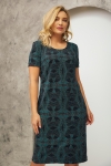 Elegancka sukienka z dzianiny o ołówkowym kroju z krótkim rękawem. Sukienka w kolorze ciemnej zieleni w geometryczny czarny wzór z subtelnie połyskującymi, kolorowymi zdobieniami z brokatu. Świetnie sprawdzi się na przyjęcia okolicznościowe, bale sylwestrowe, bale karnawałowe.