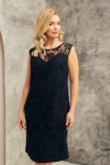 SYNTIA to sukienka w kolorze czarnym o pięknym, kobiecym kroju bez rękawów. Warstwa wierzchnia wykonana z koronki w kwiatowy wzór, subtelnie zdobiona brokatem. Z przodu posiada okrągły dekolt pod szyję z transparentnym wykończeniem co dodaje jej zmysłowości, a z tyłu w kształcie litery V. To świetna propozycja na Święta czy Sylwestra.