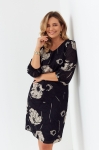 Sukienka w beżowe kwiaty na czarnym tle. Wykonana z tkaniny z dodatkiem naturalnych wiskozowych włókien. Posiada rękawy o długości 3/4, lekko prześwitujące, zakończone gumką. Jej prosty krój został przełamany tkaniną o ciekawej fakturze. Jest odpowiednia zarówno do pracy jak i na rodzinne spotkania.